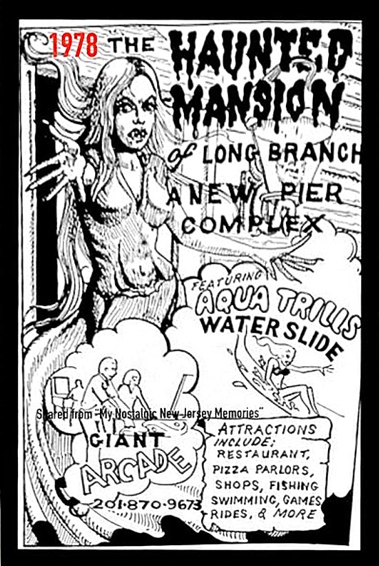 Haunted Mansion at Long Branch model. The grand opening for the 32-room, 37-actor fright-house was June 30, 1978. Admission was $2.50. It was all part of a $1 million renovation project on the city’s Amusement Pier. Staruch Associates was the architect. Owners Ric-Cic Corp. had wide interests in the family amusement business having worked in Seaside Heights, Brigantine, and Seaside Park. The Mansion burned in the June 1987 LB pier fire.