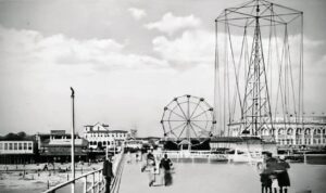 Sky High — Long Branch Pier, 1933. The “Aeroplane Swing” ride — with its 60-foot tower in the distance — opened for Summer 1922 and was a pier amusement fixture for 20 seasons. To help with the war effort, owner Dan Maher donated the tower and rotary swings (equal to 8 tons of vital scrap metal) in Sept. 1942 to the Long Branch Salvage for Victory Committee, chaired by Joseph J. Tomaini.