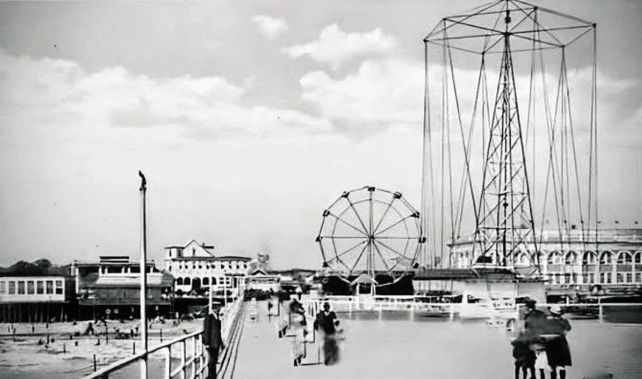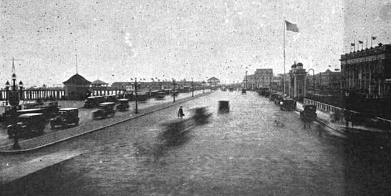 Atlantic City — The world’s first boardwalk was built there in 1870 (Steve Eccles Photo, 1906). The 500-foot-long West Jersey Pier was opened in July 1880 and wrecked by a storm 6 years later. The city’s first amusement pier, Howard’s Pier, opened in July 1882.
