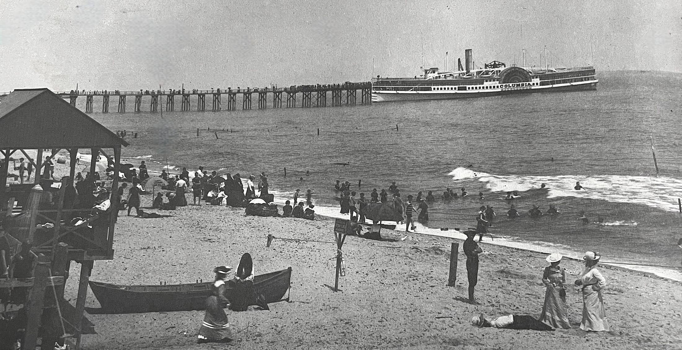 Floating Palace — Plymouth Rock steamer docked at Ocean Pier, 1875. Then owned by James Fisk, the massive steamship could carry 500 passengers and had its own orchestra band. Its accommodations were “the best that could be procured in this country or in Europe.” A round-trip LB-to-NYC fare was 50 cents. Commissioned by Cornelius Vanderbilt in 1854, the 335-foot-long ship was decommissioned in 1887.