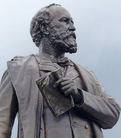 President Garfield statue watches over the city oceanfront promenade, 2019. It was moved to its present site in 1989 at a cost of $8,400. Technically on the grounds of a private hotel, the land was once the seven-acre oceanfront Garfield Park and before that, Ocean Park.