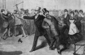 Crime Scene — President Garfield is shot in the back by Charles Guiteau at the Washington, DC railroad station, Frank Leslie’s Illustrated Newspaper, July 1881. The nation’s leader would died in Long Branch two months later.