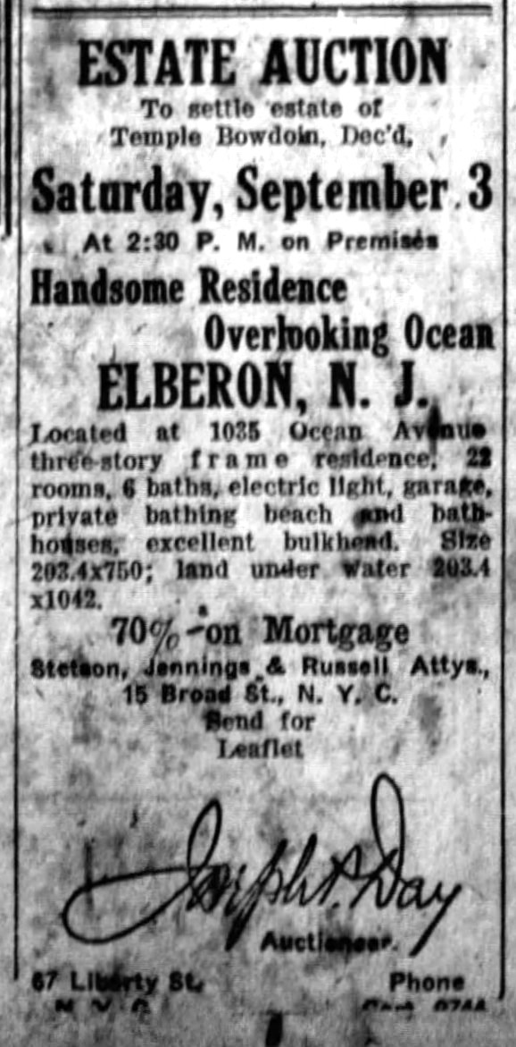 Ocean Beach Club in Elberon when it was a private home, 1880s. In March 1907, Temple Bowdoin, who managed the books at JP Morgan & Company from 1891 to 1913, bought the house from Franklin Murphy, paying $60,000. Murphy was a Republican New Jesey governor from 1902 to 1905.