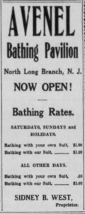 Long Branch had its share of private beach clubs, of course, now gone and mostly forgotten. Among them: White Sands Beach Club, Takanassee Beach Club, Colony Surf Club, Surfside Beach Club, Elberon Beach Club, Shipkin’s Beach Club, Gaskin’s Beach Club, USO Beach Club, Beachcomber Club, Kiernan’s Beach Club, Hollywood Baths, Brighton Baths, Neptune Baths, Colonial Baths, Dixon’s Bathing Pavilion, Miramar Beach Club, Reynolds’ Beach Club, Sand & Surf Cabana Club, and the West End Casino.