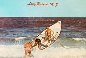 “Surf’s Up” — Long Branch oceanfront postcard, 1960s. City beaches helped popularize surfing at the Jersey Shore. According to a long-term Beach Erosion Board study on wave height at Long Branch beaches ending in 1949, it was determined that 98% of waves were 6 foot or lower (a height that begins to attract the better surfers).