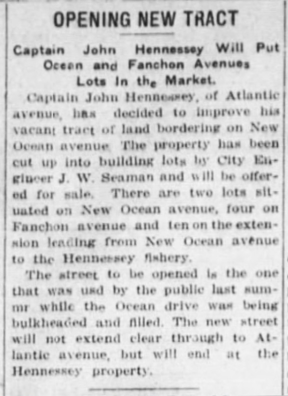 Pre-Beach — Before beach clubs the land was Hennessey’s Fishery owned by Captain John L. Hennessey who started the poundboat business in 1880. Long Branch Daily Record, March 1909. Hennessey died in August 1918.