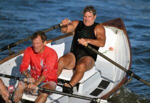 Boat Bros — Brothers Dan (l) and Bill George (r) participate in the “Paddle, Swim & Row for Sim” event held at the old Takanassee beach honoring Jim Simonelli, September 2025 (The Link News Photo).