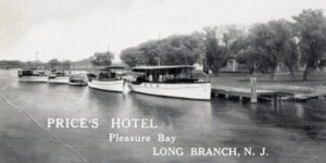 Price’s Hotel at Pleasure Bay, 1916. Born in Oceanport in May 1827, Captain Edward Hartshorne Price would become the “best known summer hotel proprietor on the Jersey Coast” before his death in February 1907. His wife and the mother of 10 children, Anna (West) helped run the business (her “shore dinners” and “clambakes” were very popular). She died in January 1898.