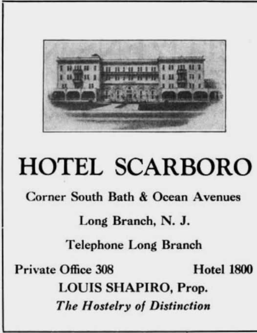 Brooklyn Daily Eagle ad, June 1920. The 42-room hotel was really in North Long Branch. The two previous owners dating back to 1911 were Anna Levine and Peter A. Walters.