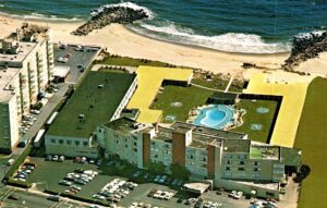 Living Large — Ocean Blvd in West End looking south, June 2022. The “Renaissance on the Ocean” at upper left off Brighton Avenue — its 10 acres are some of the city’s finest oceanfront. Opened in 1999, it’s a gated beach community with 87 luxury condominiums built in Mediterranean style. The development includes pool, spa, clubhouse, tennis courts and underground parking. Back then prices ranged from $300,000 to $2 million. The magnificent West End Cottages once stood on the grounds. The distinctive red Windmill is at the bottom; the restaurant opened in 1965.