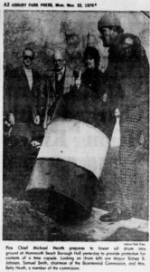 Buried Treasure? — As part of the Monmouth Beach-USA Bicentennial celebration in 1976, an organizing committee planted a time capsule (not the steel drum pictured but a vintage milk container) on borough hall grounds — with a 2026 Opening Date. From left: Mayor Sidney Johnson, Committee chair Sam Smith, and Betty and Mike Heath, committee members. Red Bank Daily Register, November 1976.