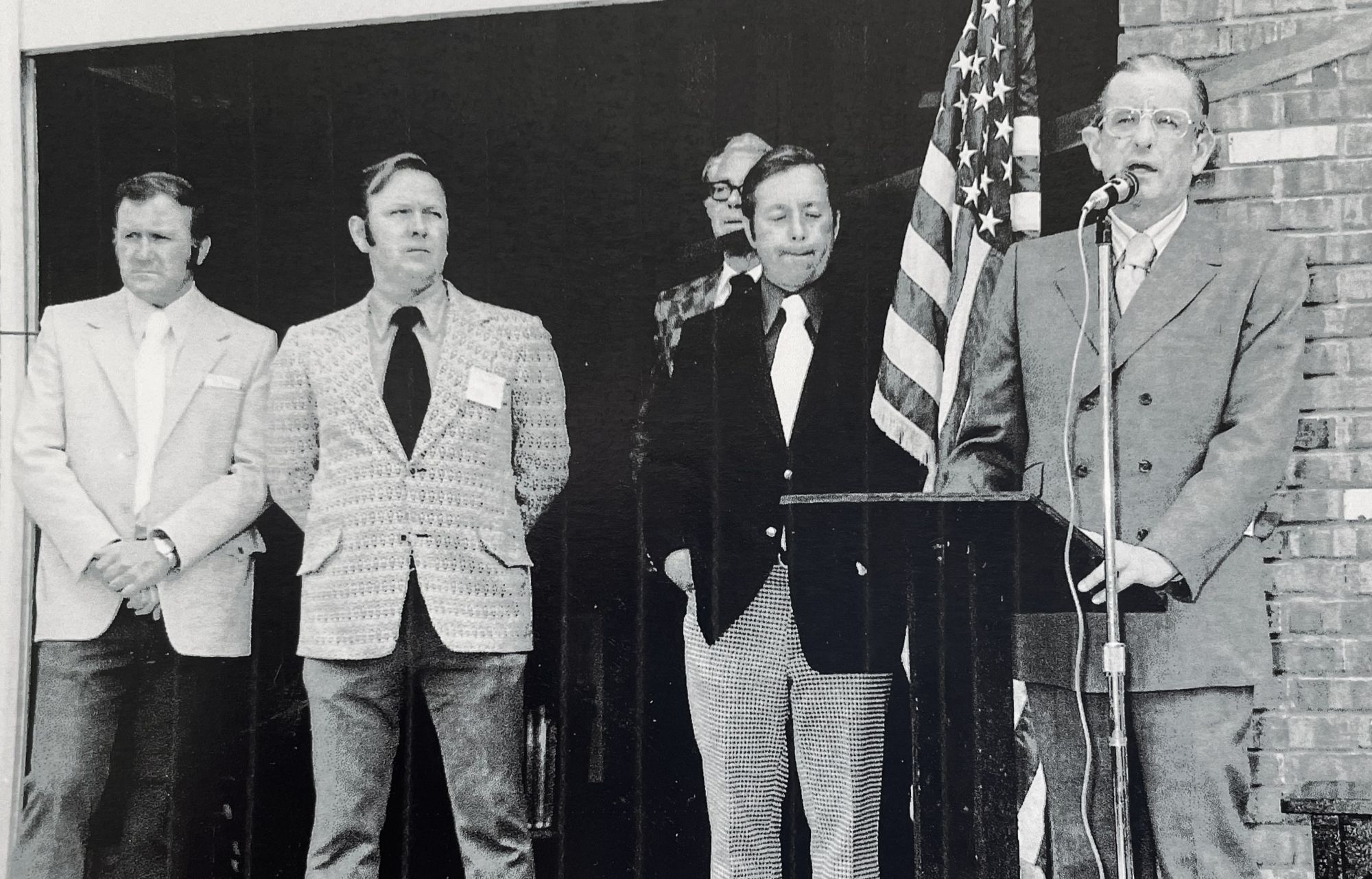 New Home — Mayor Sidney Johnson (r) speaks during dedication of new MBFA building on Beach Road, April 1973.