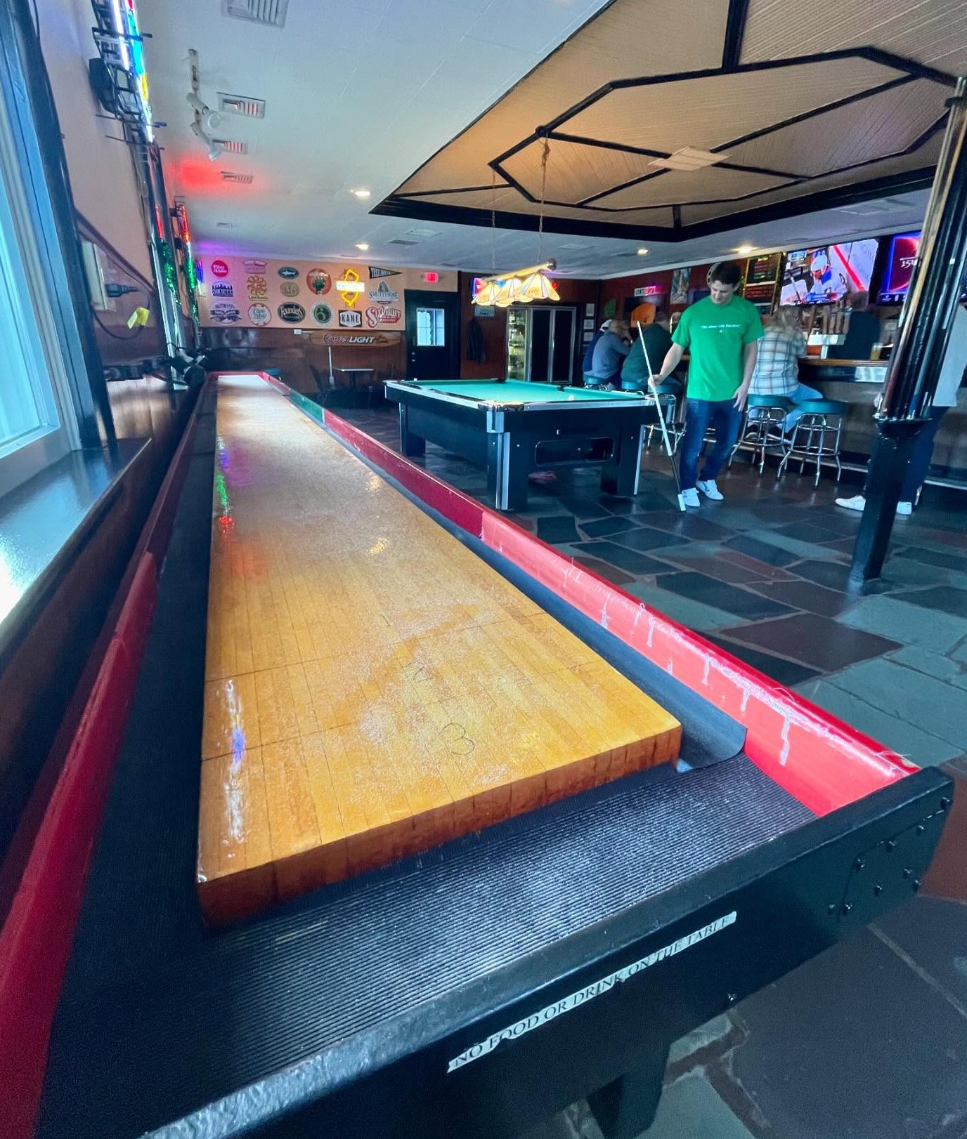 • The Boyle’s Tavern shuffleboard table is about 22-feet long. Officially called “Table Shuffleboard,” its origins are from US east coast bars and taverns.