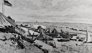 In the beginning — Sea Bright before development, 1868. Called “Nauvoo,” the first settlers were: Nathan Woolley, William Giles, and Johnty Smith, probably in 1839. At that time, the land held “three huts” was covered in “cedars and bayberry bushes” and all roads were “mere beds of sand.” Nauvoo (in Hebrew, “beautiful place”) was bestowed on Sea Bright by Mormon founder Joseph Smith during a missionary trip to Monmouth County in 1840.