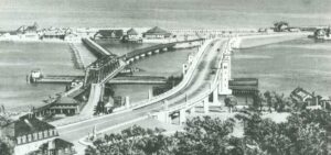 Classic Architecture — Highland Beach Pavilion and Surf Club during the resort’s glory times, Summer 1922. The exotic designs served as a draw for customers. Between 1932 and 1940, due to US Army transportation demands, the buildings were either removed or re-positioned on the resort.