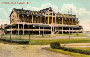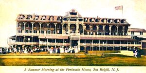 Locals called it the “P House” — a celebrated seashore gathering spot dating back to Sea Bright’s late 19th century resort glory days. A definitive part of Sea Bright’s classic coastal architecture, as well, its last vestiges went up in flames nearly 40 years ago. Season after season the Peninsula House was Sea Bright’s summer showplace — filled with character and characters. Everyone knew about it. The Asbury Park Press, the local paper of record, called the Peninsula House “a reminder of bygone elegance and grandeur.”