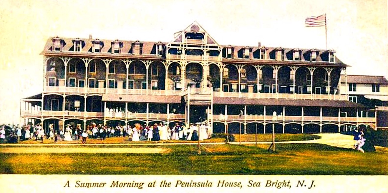 Locals called it the “P House” — a celebrated seashore gathering spot dating back to Sea Bright’s late 19th century resort glory days. A definitive part of Sea Bright’s classic coastal architecture, as well, its last vestiges went up in flames nearly 40 years ago. Season after season the Peninsula House was Sea Bright’s summer showplace — filled with character and characters. Everyone knew about it. The Asbury Park Press, the local paper of record, called the Peninsula House “a reminder of bygone elegance and grandeur.”