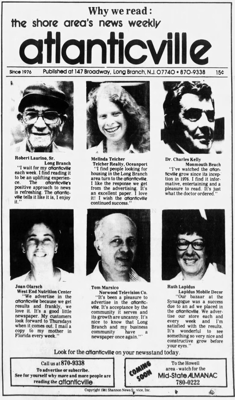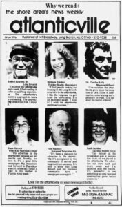 Atlanticville logo. Launched by Michael Booth 49 years ago, it no longer publishes. A longtime supporter of the Greater Long Branch Chamber of Commerce, Mike earned the service group’s highest honor the “Louis G. Libutti Community Service Award” in 1991. In the mid-1980s, he hosted a cable TV show “Around Town” for Storer Cable Communications.